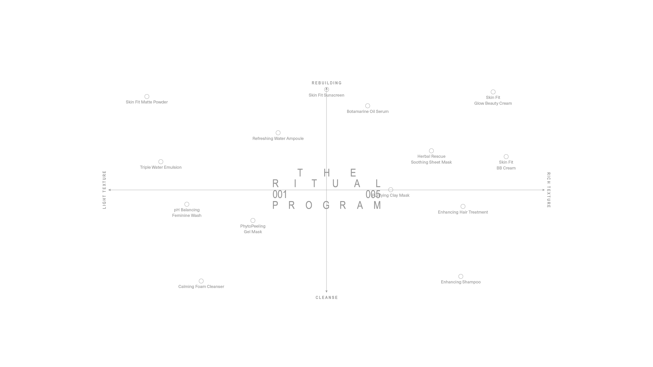 Based on this process, HAUS ARDORYOUTH developed a visual system for Shangpree The Classic, based on ’Program‘ and ’Numbering‘ systems that the brand has. In ’The Ritual Program‘, each products are divided into five ’Routines‘ and shown on the coordinate plane graph that has two axis - ’Moisture‘ and ’Cleanliness‘.